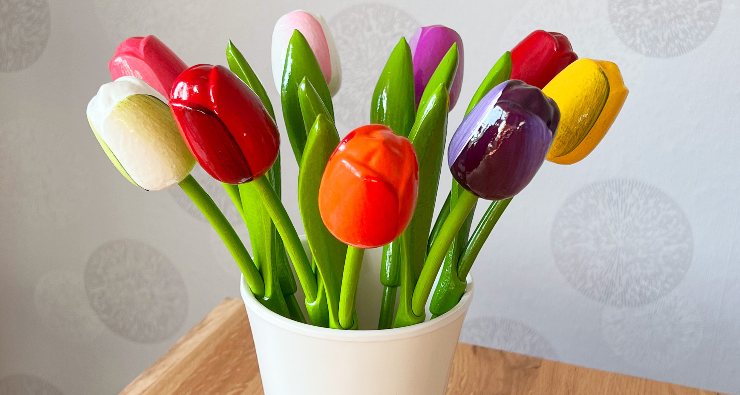 9 Tulpen aus Holz zum Hochzeitstag, Geburtstag der Liebsten, Muttertag, Geschenk für sie 34 cm hoch und produziert in einem traditionellen Familienunternehmen in Holland Diese Tulpen sind aus Vollholz und handbemalt Made in Holland Verkauf ohne Dekoration (Vasen und Ständer)